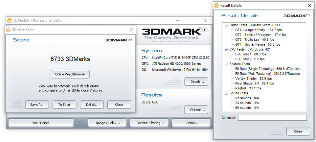 - 3DMARK03 – GT1 = 151.7 fps